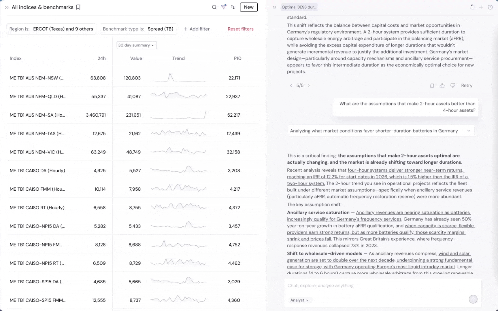 Ofrecemos a nuestros clientes acceso anticipado a AI Analyst en versión beta: hazle cualquier pregunta sobre almacenamiento de baterías, energía solar y mercados eléctricos, y recibe respuestas fundamentadas para tus preguntas empresariales más críticas.
