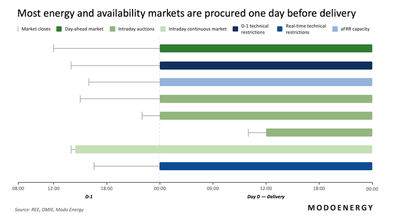 Uma bateria negociando na Espanha percorre uma sequência de mercados. Cada janela de negociação abre e fecha em uma ordem fixa entre o mercado do dia anterior e a entrega em tempo real. Dois operadores gerenciam essa sequência.